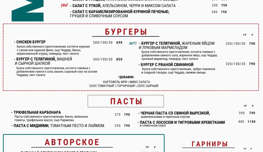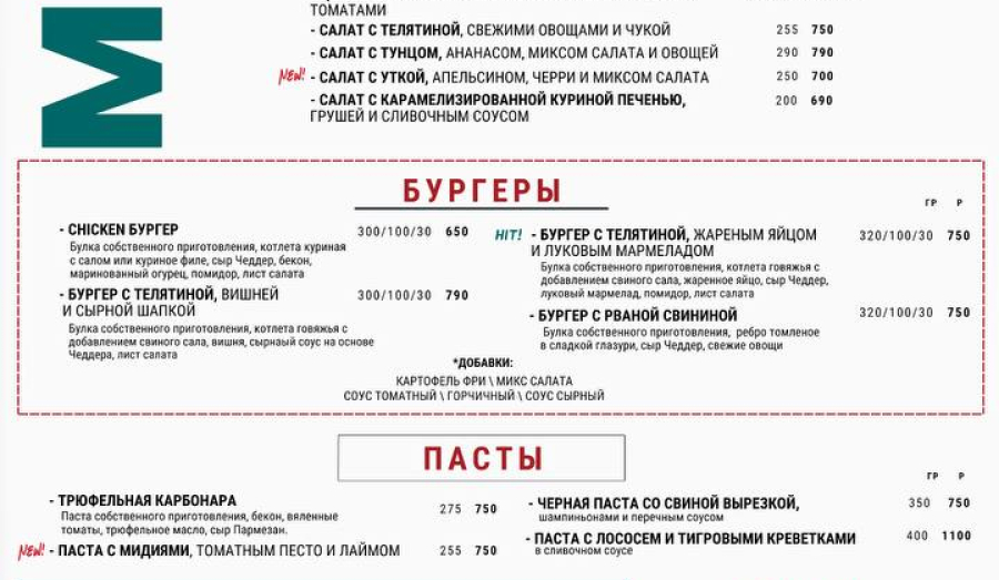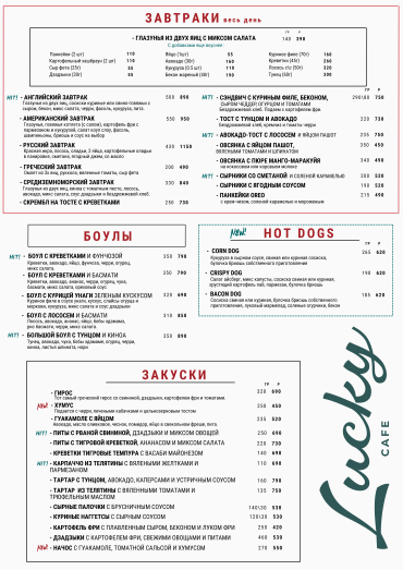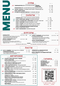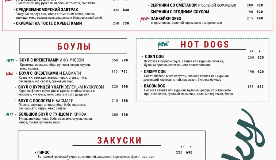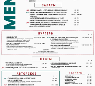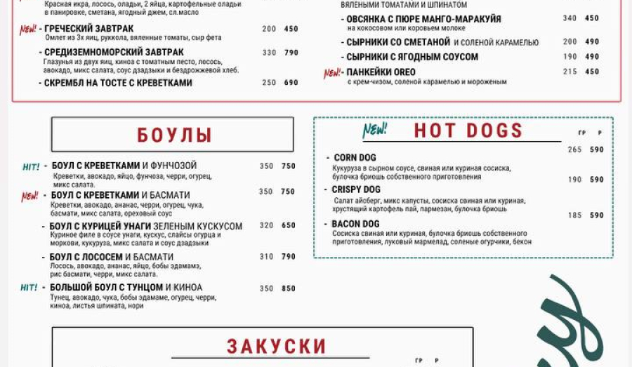 Здесь вы можете заказать: вкусные завтраки, различные закуски и салаты, пасты, авторские блюда, боулы, супы, бургеры и многое другое.