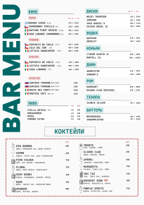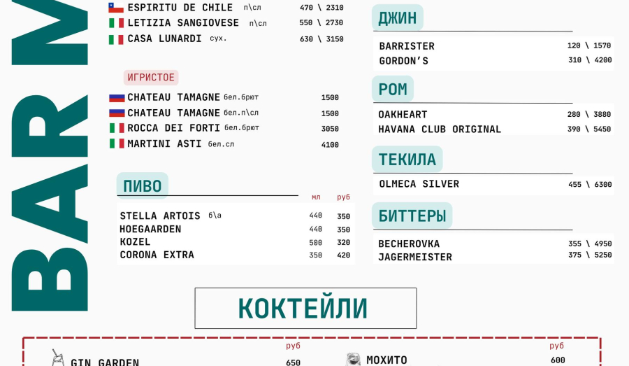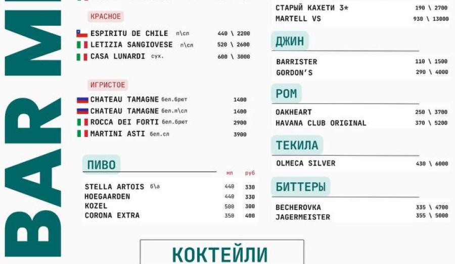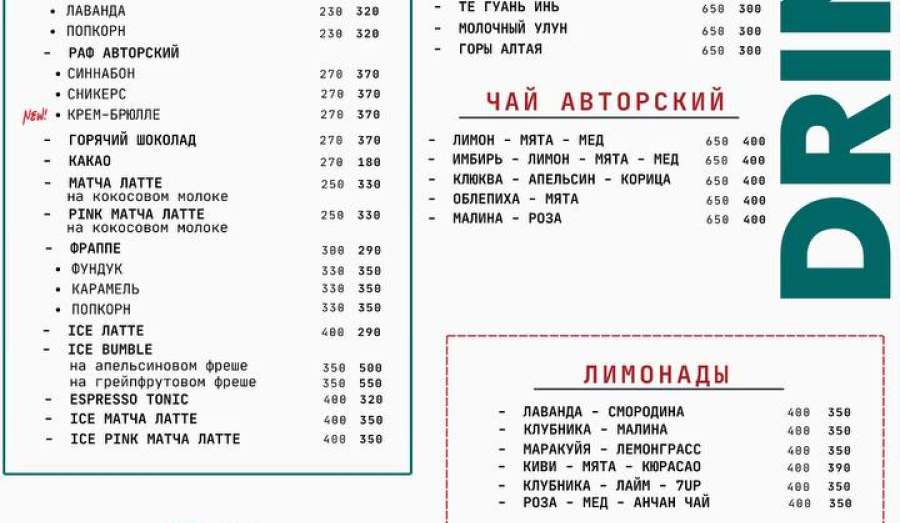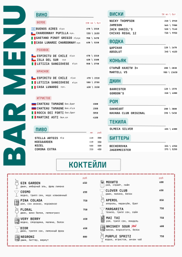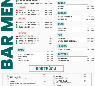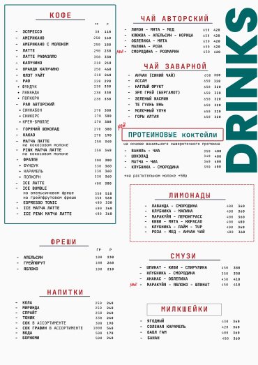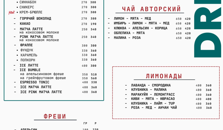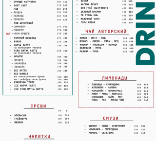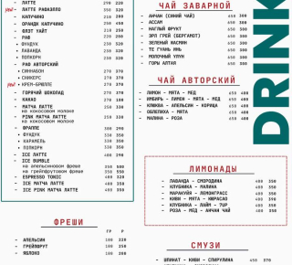 А также: кофе, чай в большом ассортименте, фреш, лимонад, смузи, разливное пиво, напитки.
