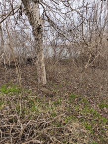 На участке разрушенный дом, есть фруктовые деревья и кустарники.