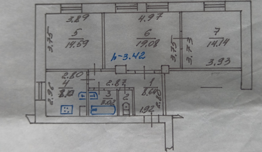 Хороший потенциал для перепланировки, можно существенно увеличить кухню и получить интересную двухкомнатную квартиру современного типа.