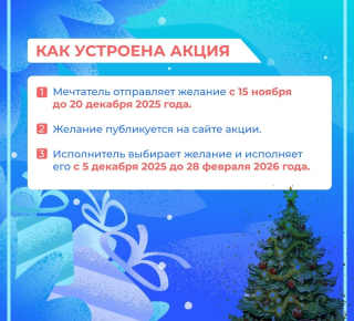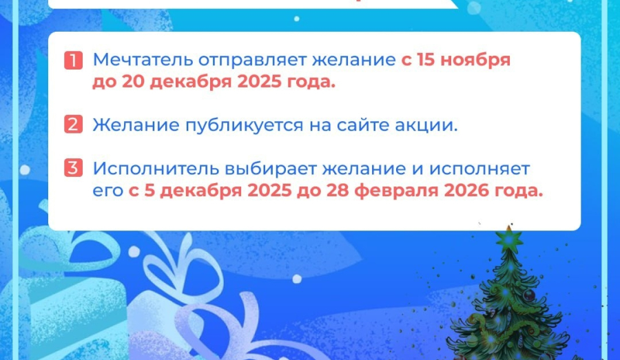- Исполнитель выбирает желание и исполняет его с 5 декабря 2025 до 28 февраля 2026 года.