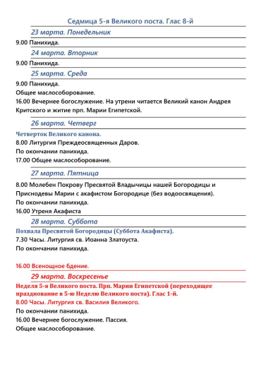 Расписание богослужений | Свято-Покровский собор | Со 2 по 29 марта 2026 г.