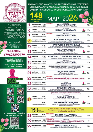 Здесь вы найдете репертуар на март 2026 г. в театре "Мариупольский республиканский академический ордена "Знак Почёта" русский драматический театр"