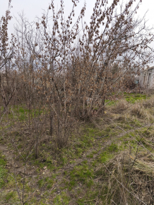 На участке разрушенный дом, есть фруктовые деревья и кустарники.