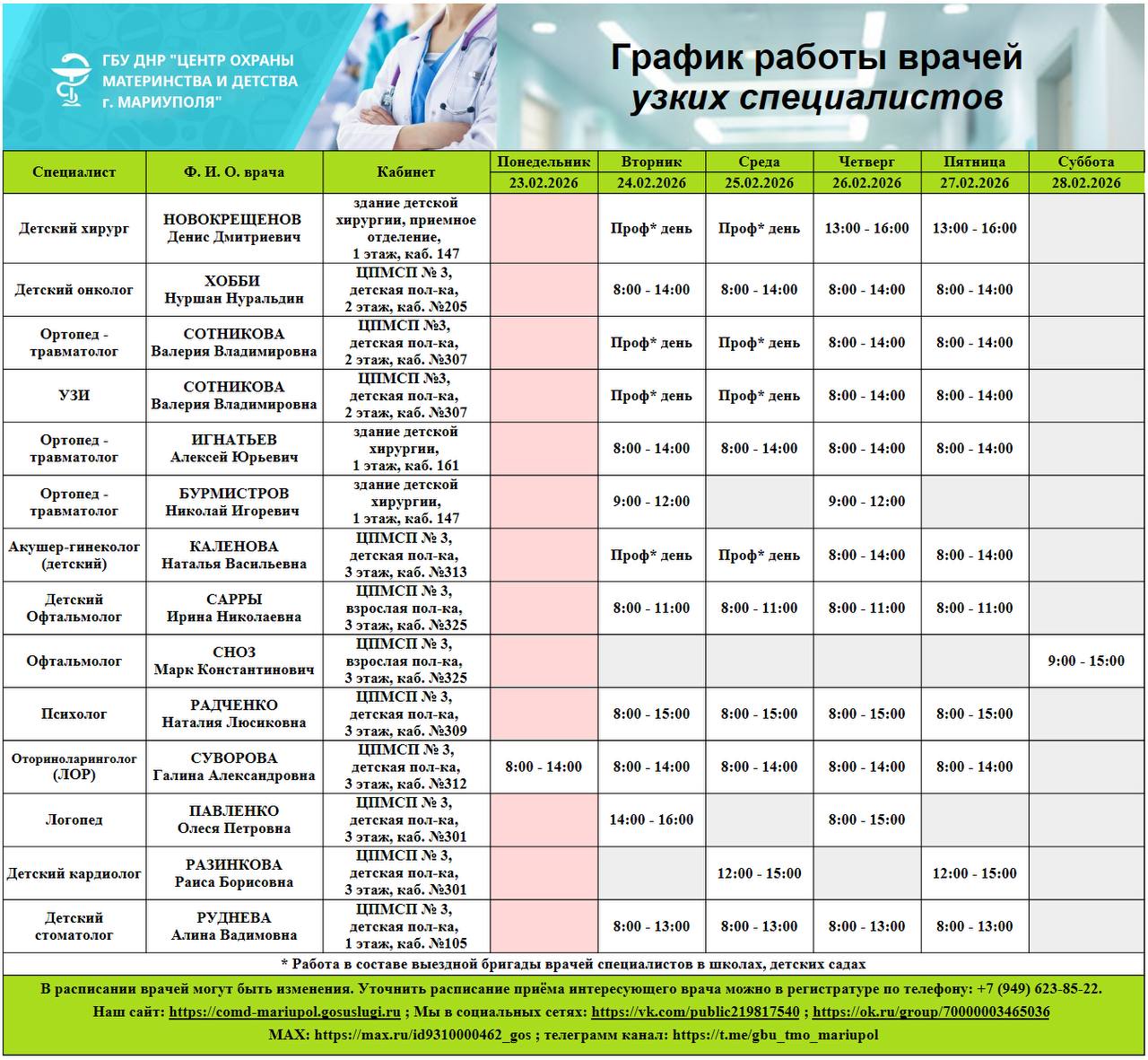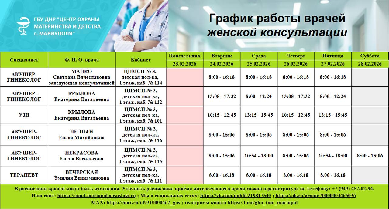 График работы врачей ГБУ ДНР "Центр охраны материнства и детства г. Мариуполя" 23 по 28 февраля 2026