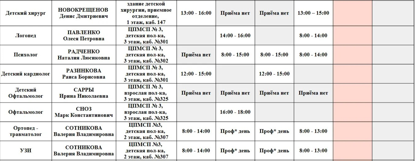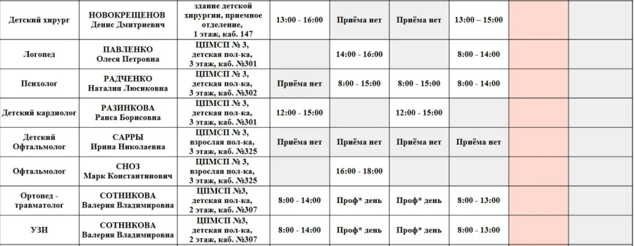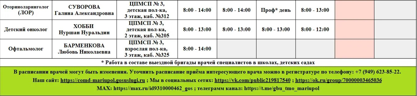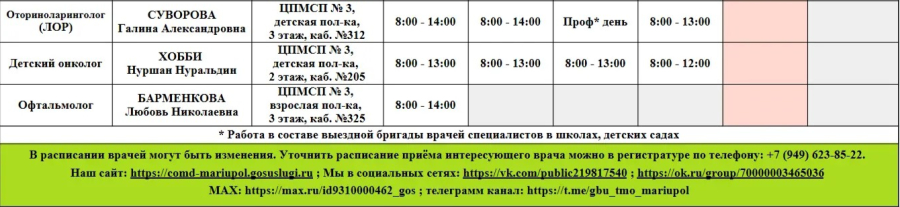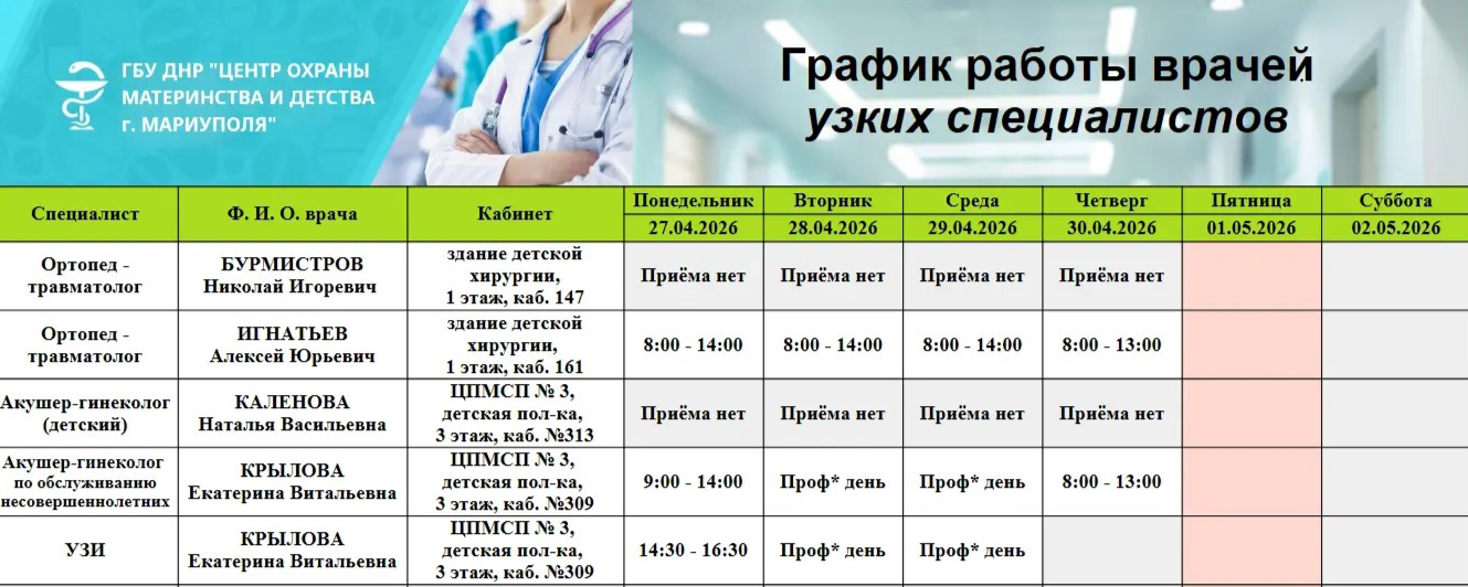 График работы врачей ГБУ ДНР "Центр охраны материнства и детства г. Мариуполя" | С 27 по 30 апреля 2026