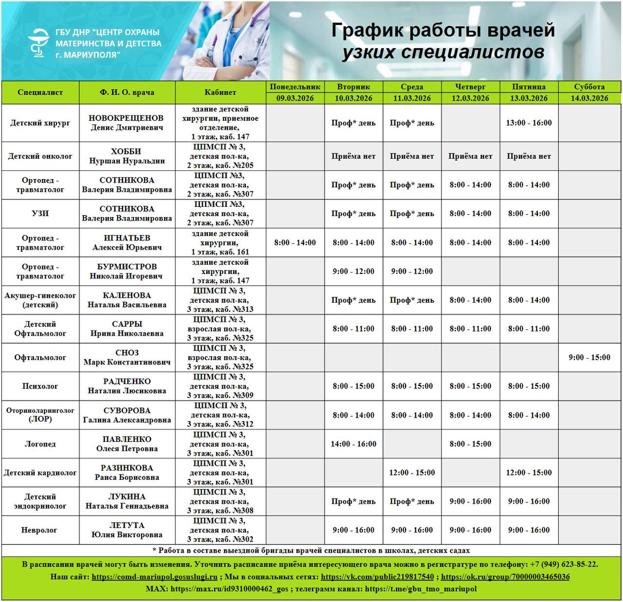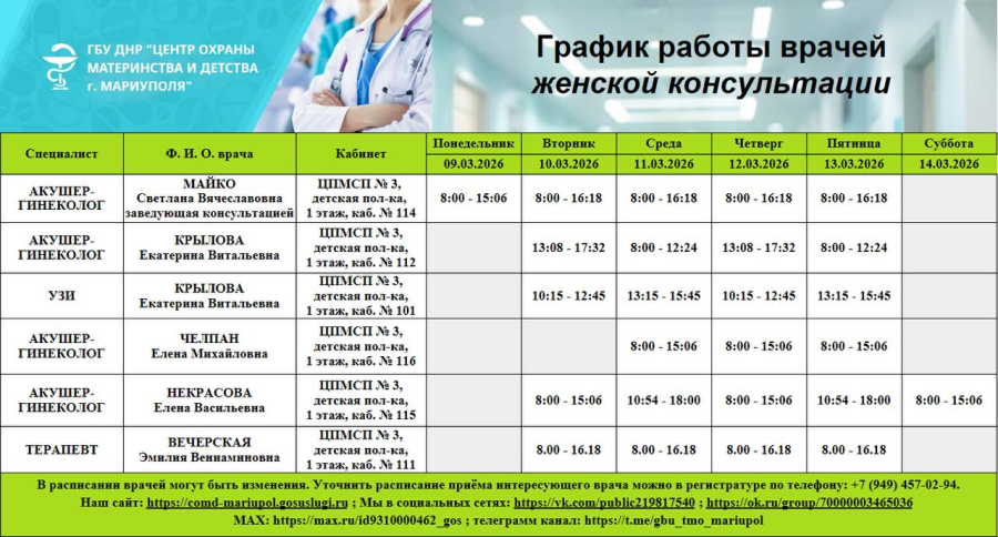 График работы врачей ГБУ ДНР "Центр охраны материнства и детства г. Мариуполя" | С 9 по 14 марта 2026