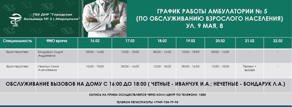 График работы врачей ГБУ "Городская больница №2" | C 16 по 21 февраля 2026 г.