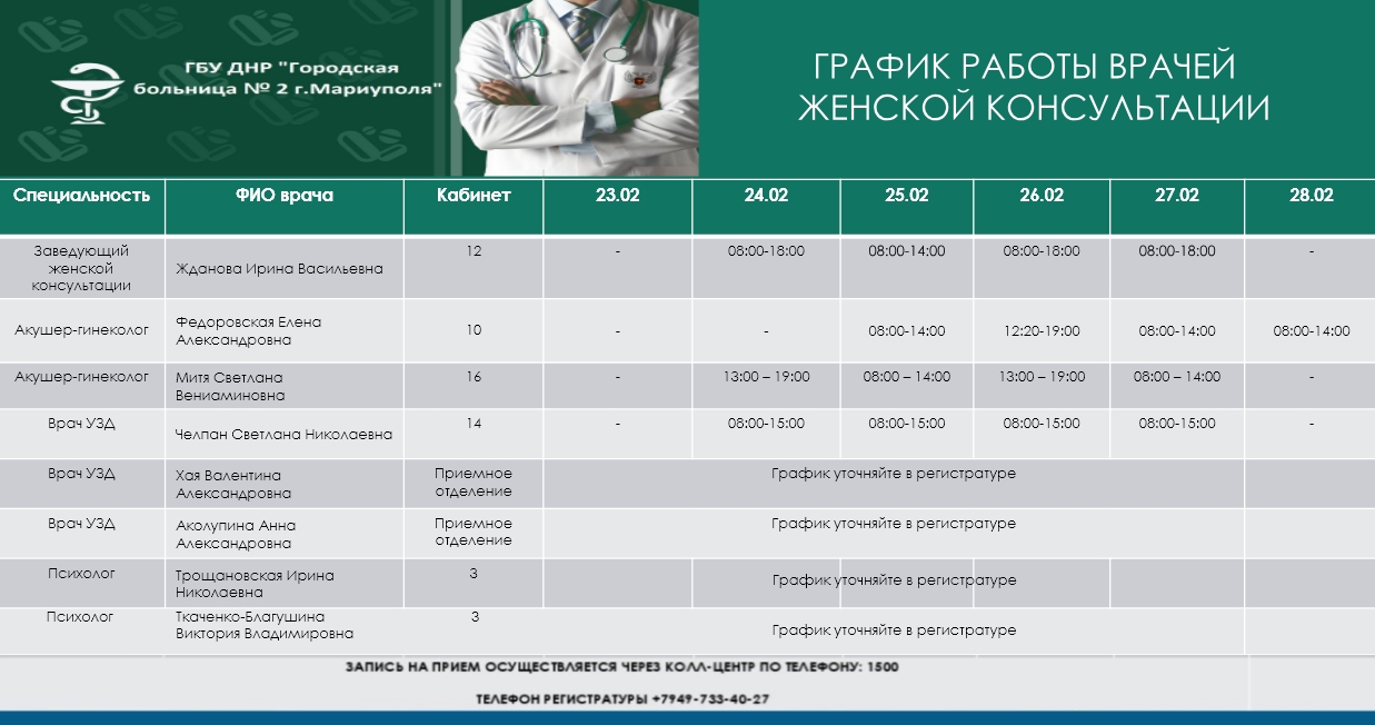 График работы врачей ГБУ "Городская больница №2" (Левый берег) | C 24 по 28 февраля 2026 г.