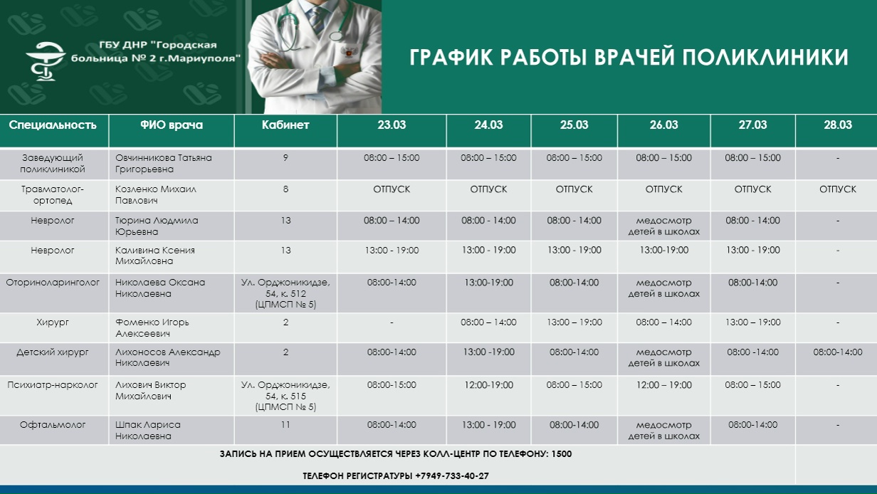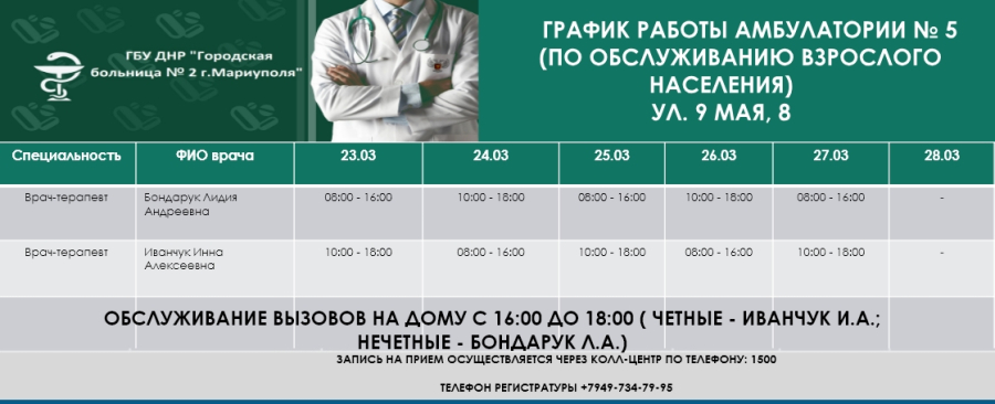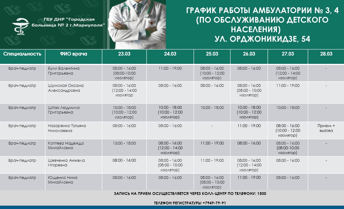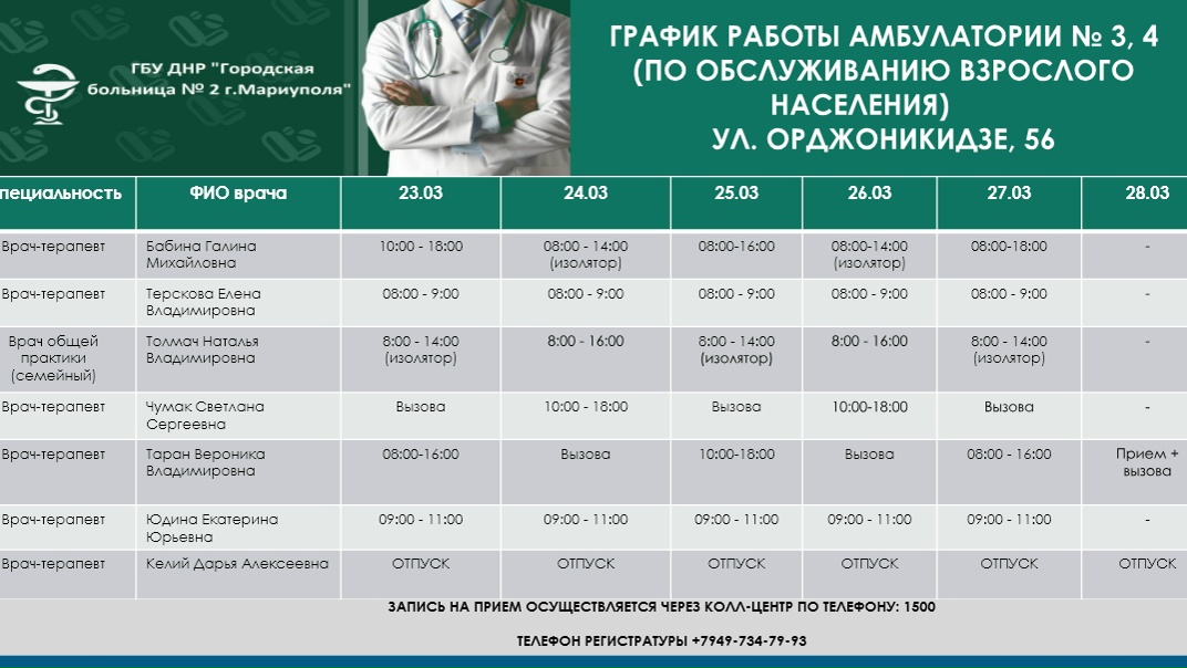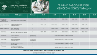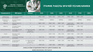 Смотрите график приема врачей поликлиники взрослой и детской, женской консультации и амбулаторий 3, 4, 5 - C 23.03.2026 по 28.03.2026