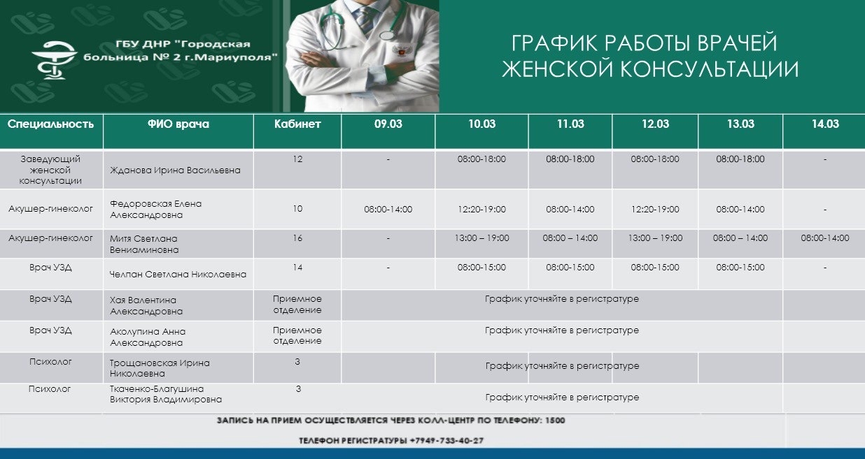 График работы врачей ГБУ "Городская больница №2" (Левый берег) С 9 по 14 марта 2026 г.