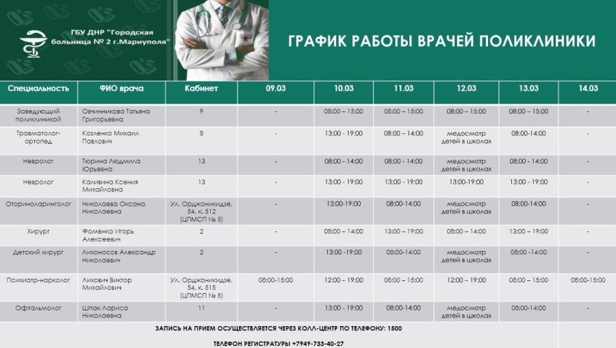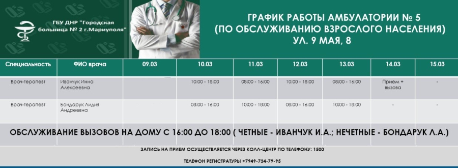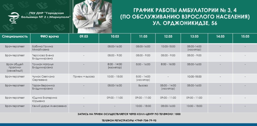 Смотрите график приема врачей поликлиники взрослой и детской, женской консультации и амбулаторий 3, 4, 5 - с 9 по 14 марта 2026 года