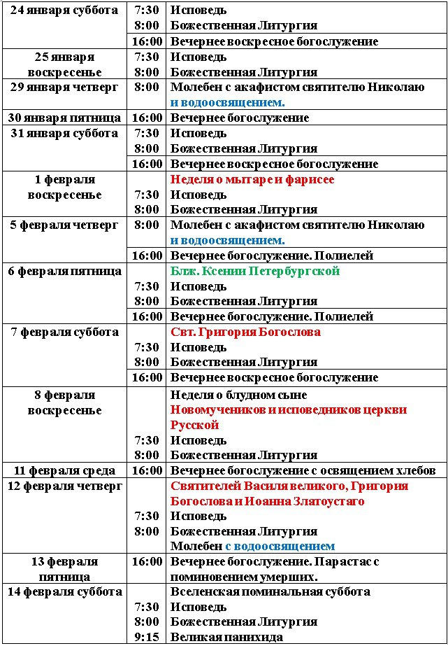 Расписание богослужений | С 1 по 14 февраля | Свято-Николаевский храм в Приморском р-не