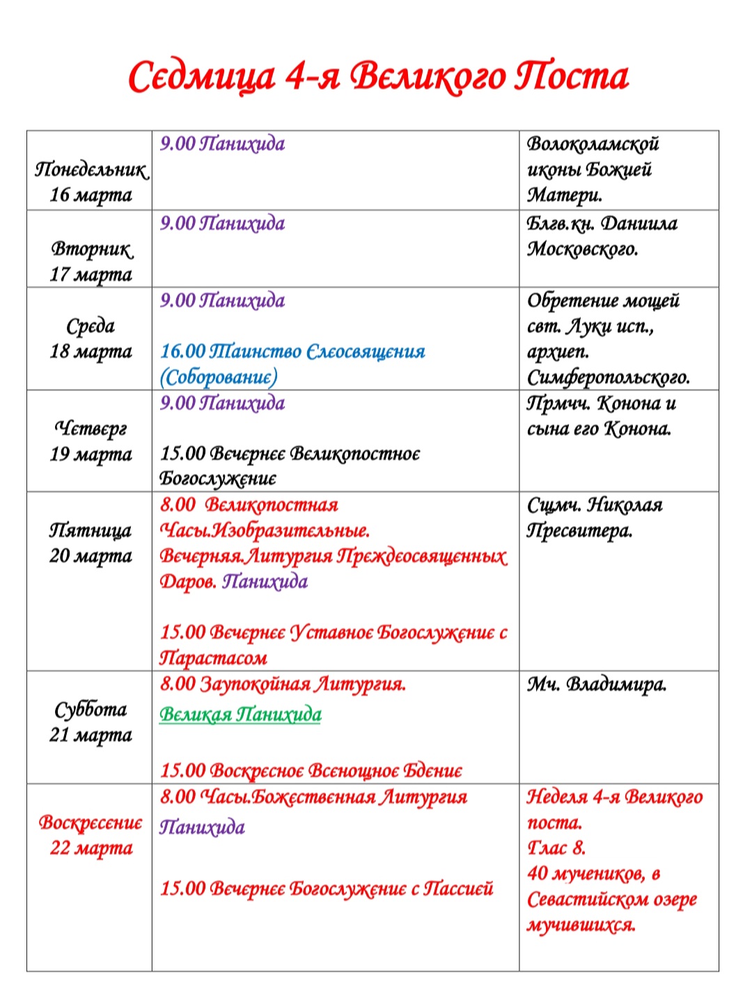 Расписание богослужений | С 16 по 22 марта | Собор Архистратига Михаила (Свято-Михайловский Собор)