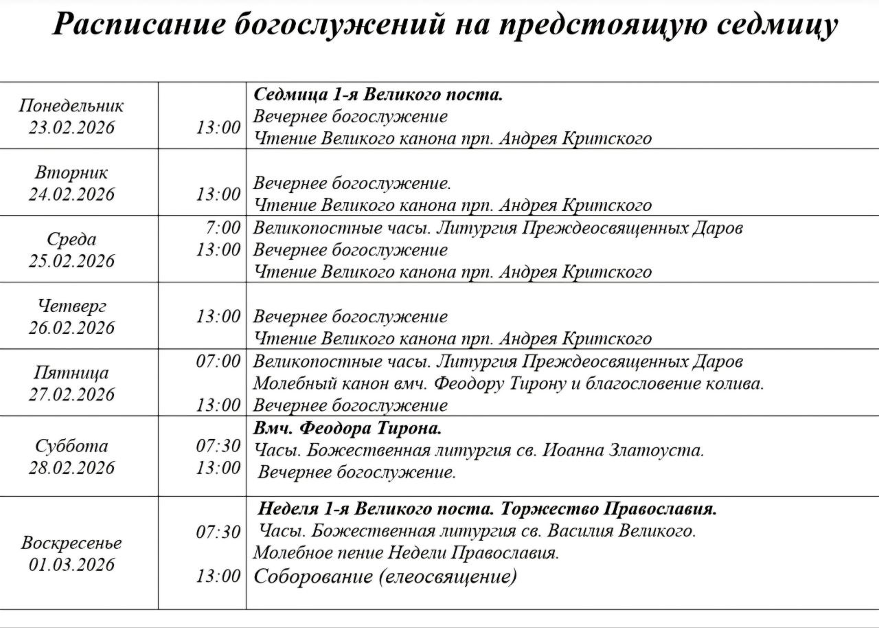 Расписание богослужений | С 23 февраля по 1 марта | Свято-Покровский храм (левый берег)