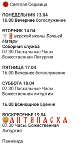 Расписание богослужений в Соборе Архистратига Михаила в г. Мариуполе (Свято-Михайловский Собор) с 13.04.2026 по 19.04.2026