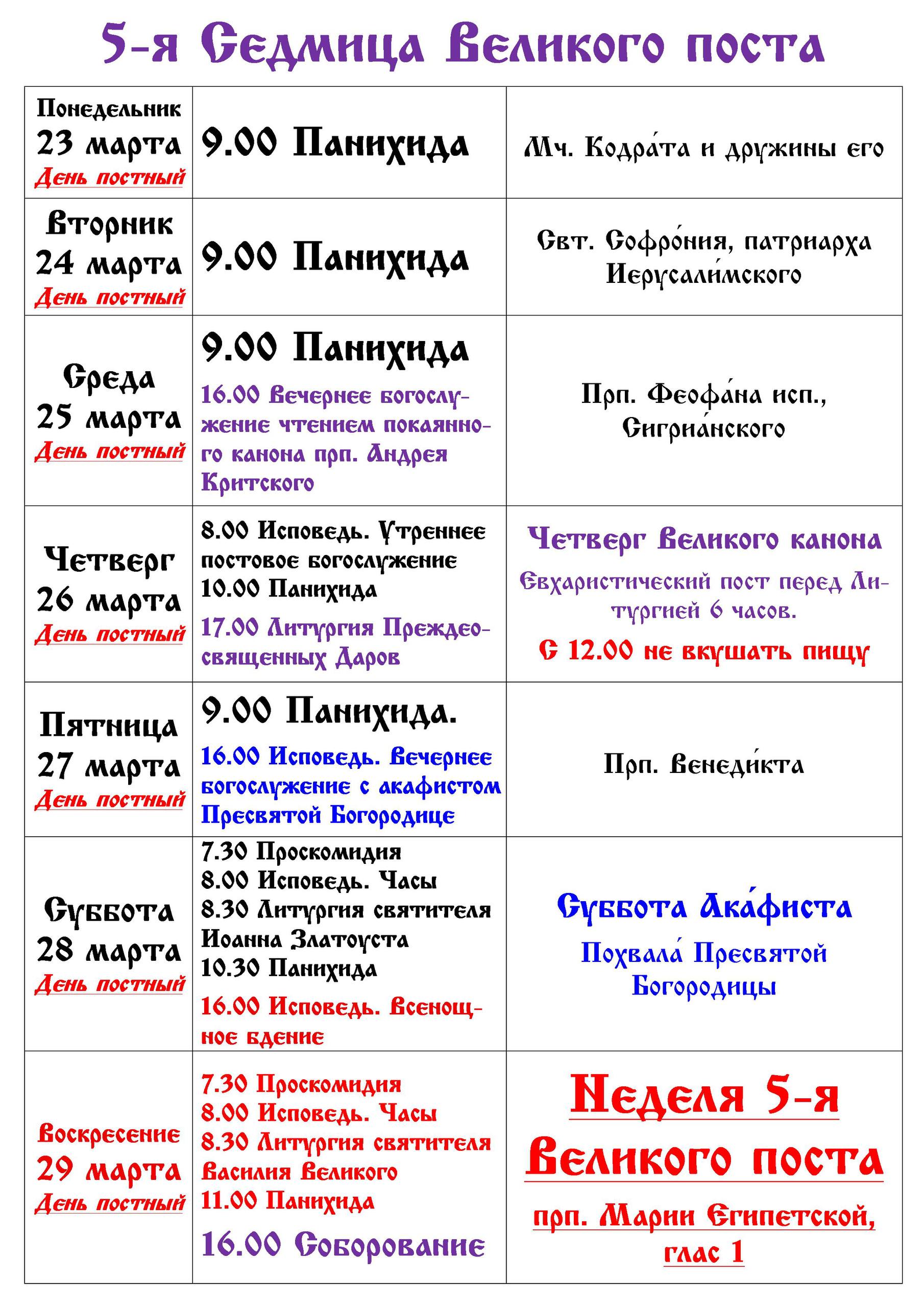Расписание богослужений | С 23 по 29 марта | Свято-Троицкий храм г. Мариуполя