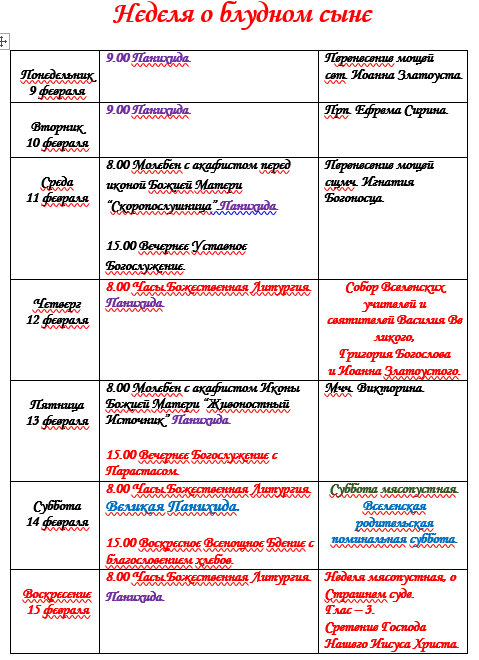 Расписание богослужений | С 9 по 15 февраля | Собор Архистратига Михаила