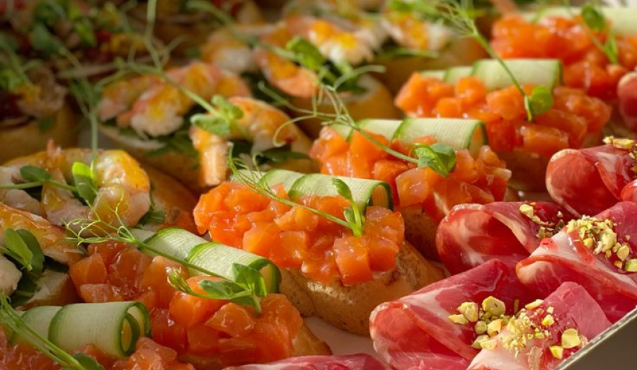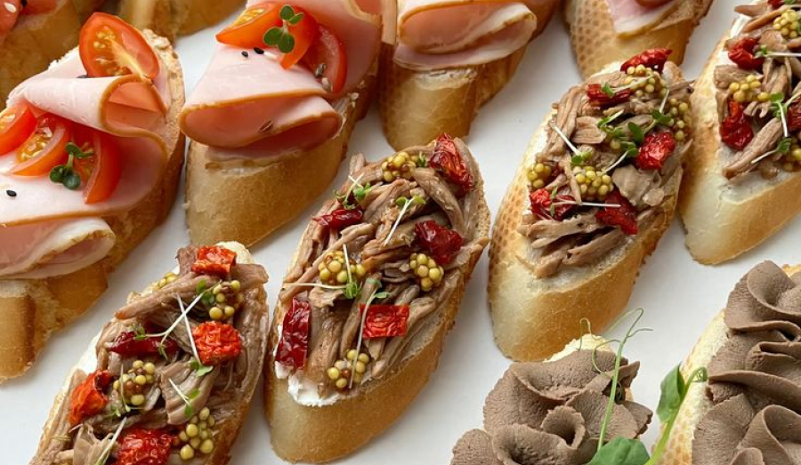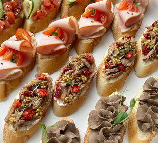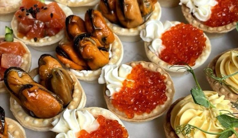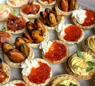 Изысканные мини-закуски: Канапе с нежнейшим лососем и авокадо, элегантные тарталетки с деликатесными паштетами, свежайшие брускетты с авторскими начинками.